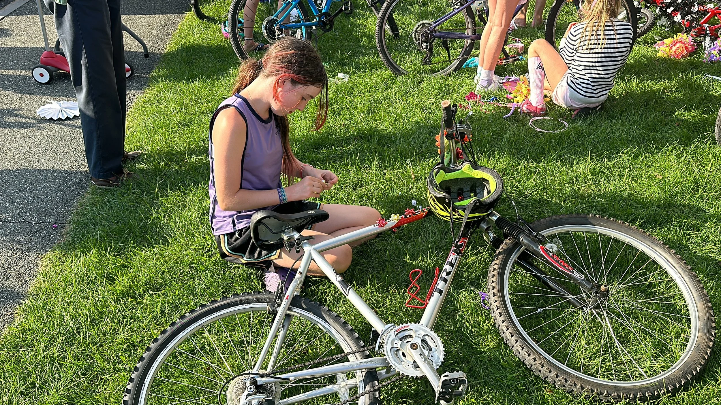 On Thursday, August 8, a crowd of hundreds gathered at the end of Main Street for the 24th Annual Bike Parade & Ice Cream Social. The evening started with bike “decorating” on the lawn of The Neighborhood House. Kids (and adults) took advantage of a huge supply of festive decor— bows, streamers, stickers and more— to make their rides stand out.